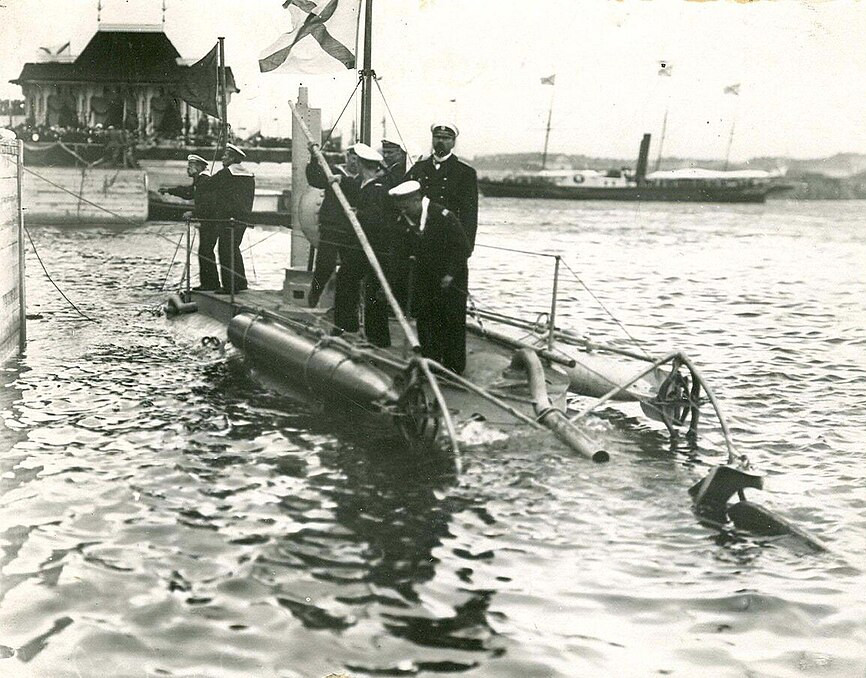 Файл:Михаил Беклемишев на спуске на воду русской подлодки Дельфин (1903).jpg