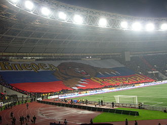 Русский медведь и слоган «Вперёд, Россия!» на гигантском знамени российских футбольных болельщиков.